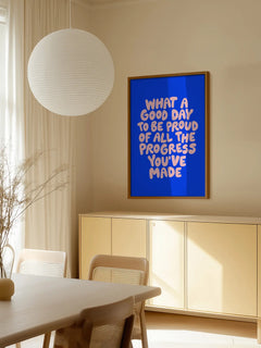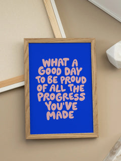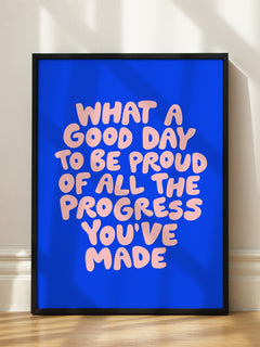 Dieses Poster zeigt den motivierenden Text „WHAT A GOOD DAY TO BE PROUD OF ALL THE PROGRESS YOU'VE MADE“ in großen, verspielten Buchstaben auf einem kräftigen blauen Hintergrund. Die Botschaft ermutigt dazu, stolz auf die eigenen Fortschritte zu sein und bietet eine positive Erinnerung für jeden Tag. Perfekt für einen Ort, den man häufig sieht, um sich immer wieder an die eigenen Erfolge zu erinnern.