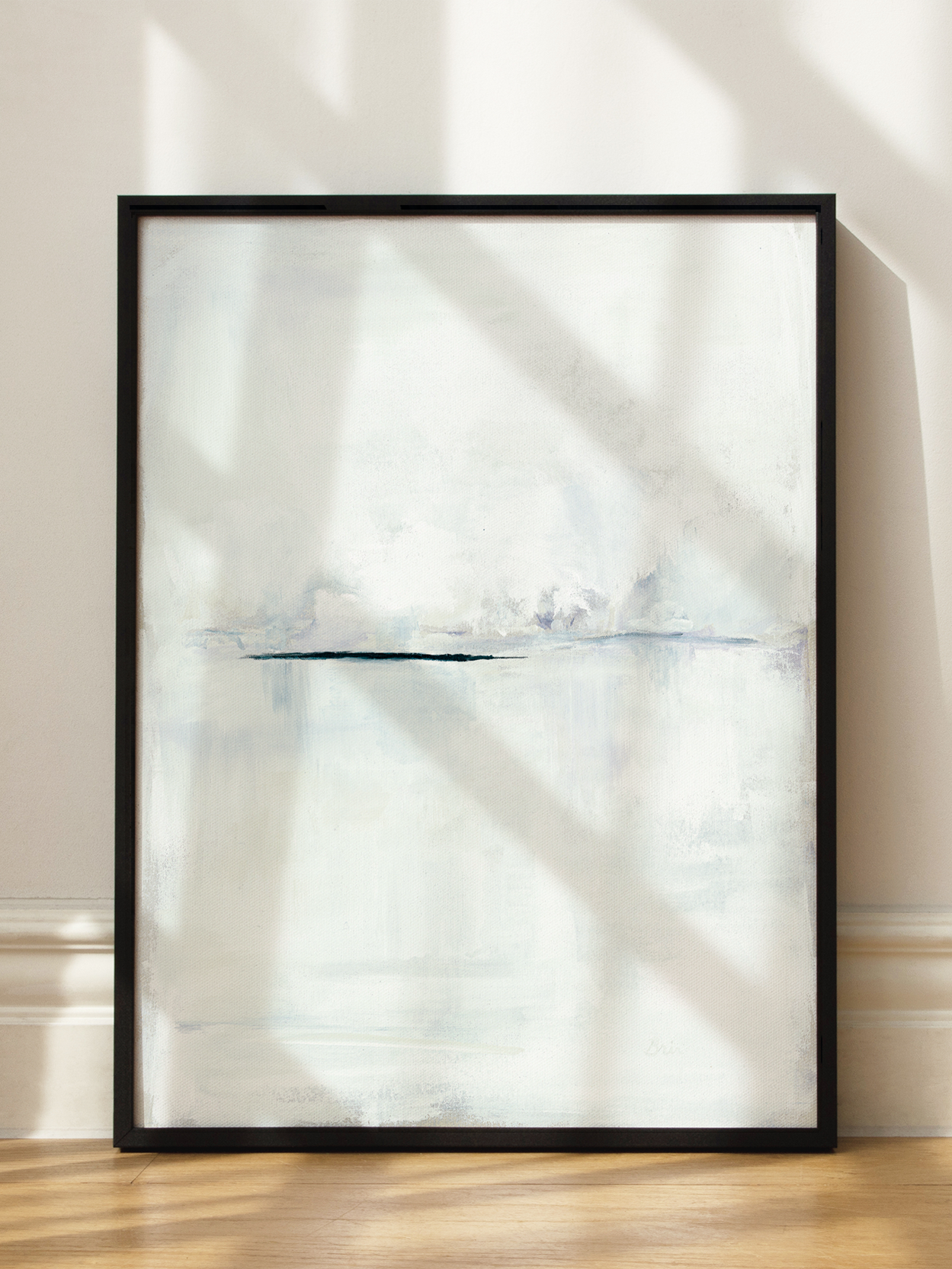 Dieses Bild zeigt ein abstraktes Kunstwerk mit einem subtilen Horizont in der Mitte, der in sanften, hellen Farben gehalten ist. Die Komposition vermittelt ein Gefühl von Ruhe und Weite und eignet sich perfekt, um einen modernen und minimalistischen Look in deinem Zuhause zu schaffen.