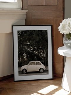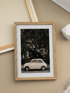 Ein stilvolles Poster, das ein cremefarbenes Auto vor einem üppigen grünen Baum zeigt. Dieses Bild fängt den Charme eines klassischen Fahrzeugs in einer urbanen Umgebung ein und ist ideal für Autofans und Liebhaber von Retro-Designs. Es verleiht jedem Raum einen Hauch von Nostalgie und Modernität.