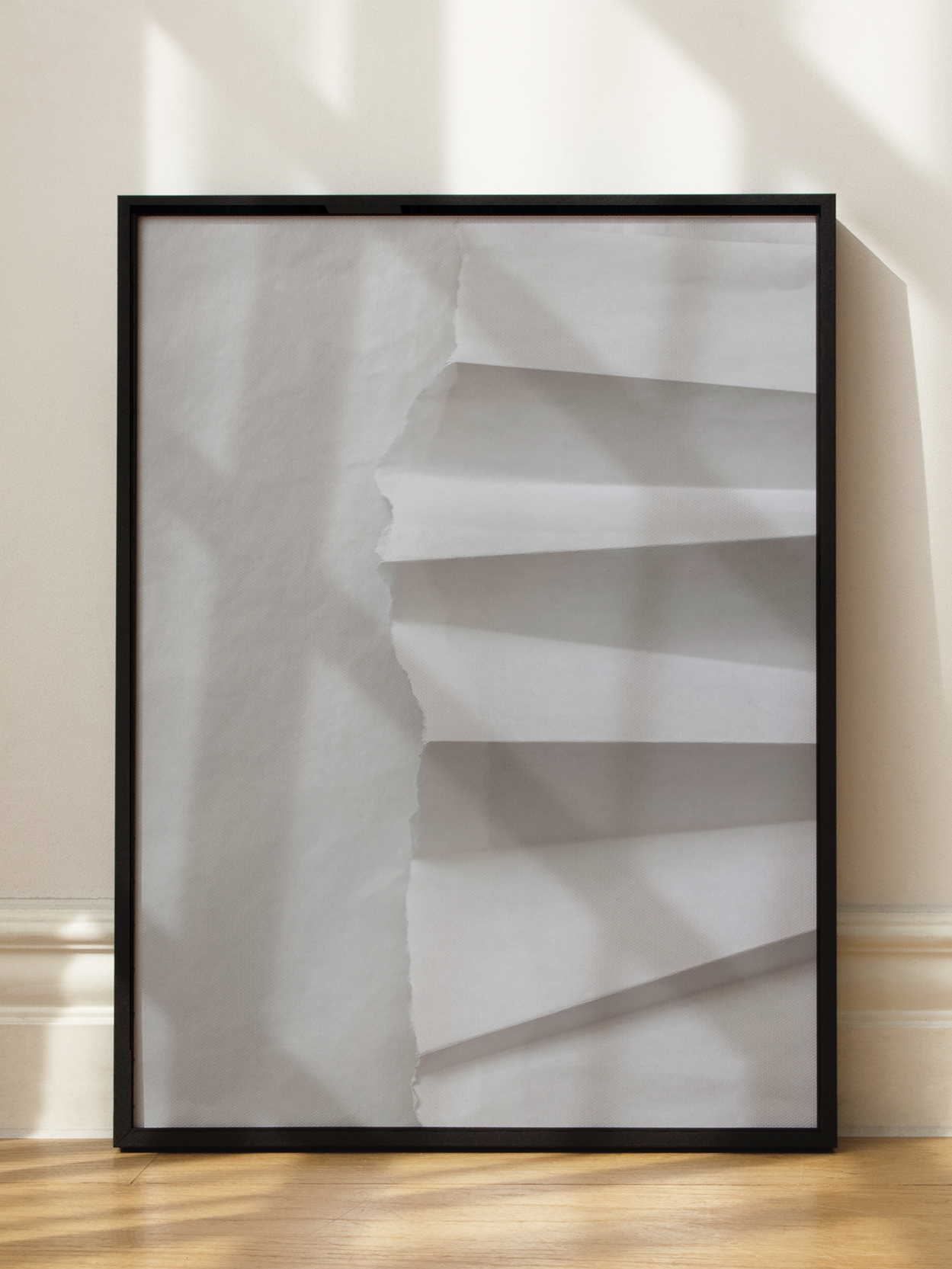 Dieses Poster zeigt eine Fotografie von gefaltetem weißen Papier. Die minimalistische Komposition hebt die Textur und die Schatten der Falten hervor und schafft ein ruhiges und modernes Ambiente. Ideal für ein zeitgenössisches Zuhause, das Wert auf schlichte Eleganz legt.