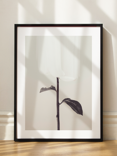 Diese elegante Schwarz-Weiß-Fotografie zeigt eine weiße Rose mit einem dunklen Stiel und Blättern vor einem hellgrauen Hintergrund. Das Bild strahlt eine zeitlose Schönheit und Ruhe aus, die perfekt in jedes Interieur passt. Blumenposter sind zeitlose Klassiker, die jedem Raum eine subtile Eleganz verleihen.