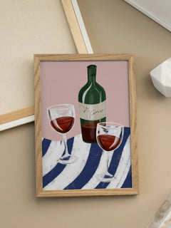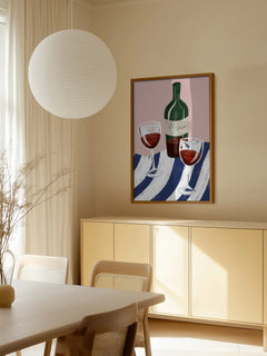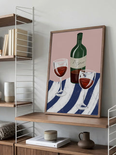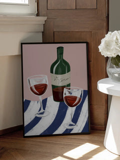 Dieses moderne Poster zeigt eine stilvolle Illustration von zwei Gläsern Rotwein und einer Weinflasche, die auf einem gestreiften Tuch platziert sind. Der Hintergrund ist in einem sanften Rosa gehalten, was den trendigen und zeitgenössischen Charakter des Kunstwerks unterstreicht. Die harmonische Farbgebung und das elegante Design machen dieses Poster zu einem perfekten Akzent für jede moderne Einrichtung.