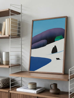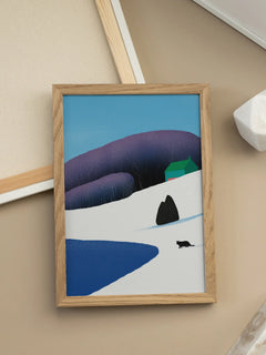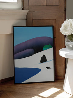 Dieses Poster zeigt eine Katze, die durch eine verschneite Winterlandschaft streift. Im Hintergrund ist ein grünes Haus zu sehen, das die ruhige und friedliche Szene abrundet. Die schneebedeckten Hügel und der klare blaue Himmel verleihen dem Bild eine frische und kühle Atmosphäre. Ideal für alle, die die Schönheit des Winters und die Eleganz von Katzen schätzen.