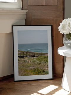 Dieses Poster zeigt einen Holzsteg, der sich durch eine malerische Landschaft schlängelt und den Blick auf das weite blaue Meer freigibt. Die üppigen grünen Pflanzen, die den Steg säumen, verleihen dem Bild Lebendigkeit und Frische. Die Komposition fängt die raue Schönheit der Natur ein und lädt dazu ein, sich in die friedliche Atmosphäre der Küstenlandschaft zu vertiefen.