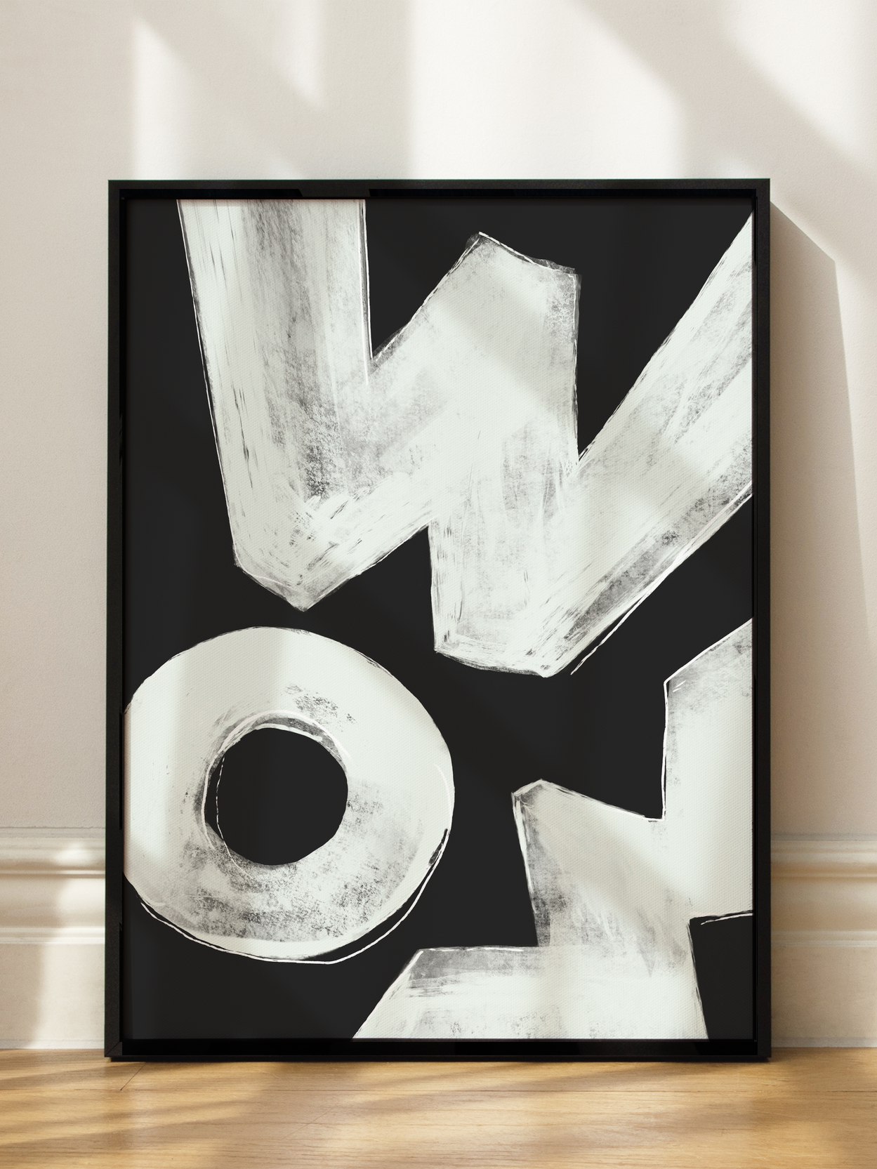 Dieses abstrakte Poster zeigt weiße Buchstaben auf einem tiefschwarzen Hintergrund. Die Buchstaben sind in einem künstlerischen, unregelmäßigen Stil gestaltet, der dem Bild eine dynamische und moderne Ausstrahlung verleiht. Perfekt für ein zeitgenössisches Zuhause, bringt dieses Kunstwerk eine kühne und stilvolle Note in jeden Raum.