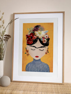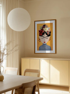 Diese Illustration zeigt eine Frau mit geschlossenen Augen, die einen prächtigen Blumenkranz auf dem Kopf trägt. Der Hintergrund ist in einem lebendigen Gelb gehalten, das die leuchtenden Farben der Blumen hervorhebt. Die Kombination aus kräftigen Rottönen, zarten Rosa- und Weißtönen sowie grünen Blättern verleiht dem Bild eine fröhliche und künstlerische Ausstrahlung. Perfekt, um jedem Raum einen lebendigen und kreativen Touch zu verleihen.