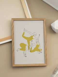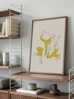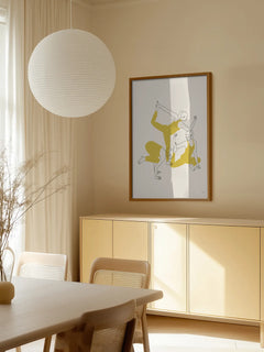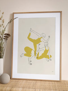 Diese Illustration zeigt drei Frauen in gelben Yoga-Outfits, die verschiedene Yoga-Posen einnehmen. Der minimalistische Stil der Zeichnung wird durch den hellbeigen Hintergrund unterstrichen, der den Fokus auf die harmonischen Bewegungen und die Eleganz der Posen lenkt. Diese Darstellung von Yoga vermittelt ein Gefühl von Ruhe und Balance und ist perfekt für jeden Raum, der eine entspannende und inspirierende Atmosphäre schaffen möchte.