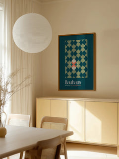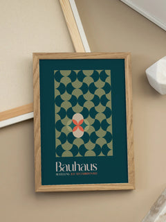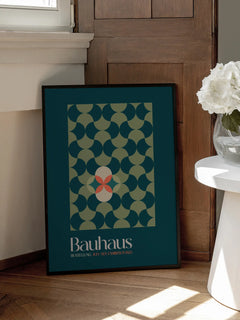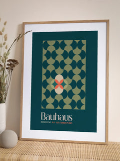 Dieses Poster zeigt ein geometrisches Muster in Grün auf einem dunkelgrünen Hintergrund. Im Zentrum befindet sich ein beiger und roter Kreis, darunter der Text "Bauhaus Ausstellung July-Sep. Exhibition 1923". Der Druck ist farbenfroh und bringt Leben an jede Wand.