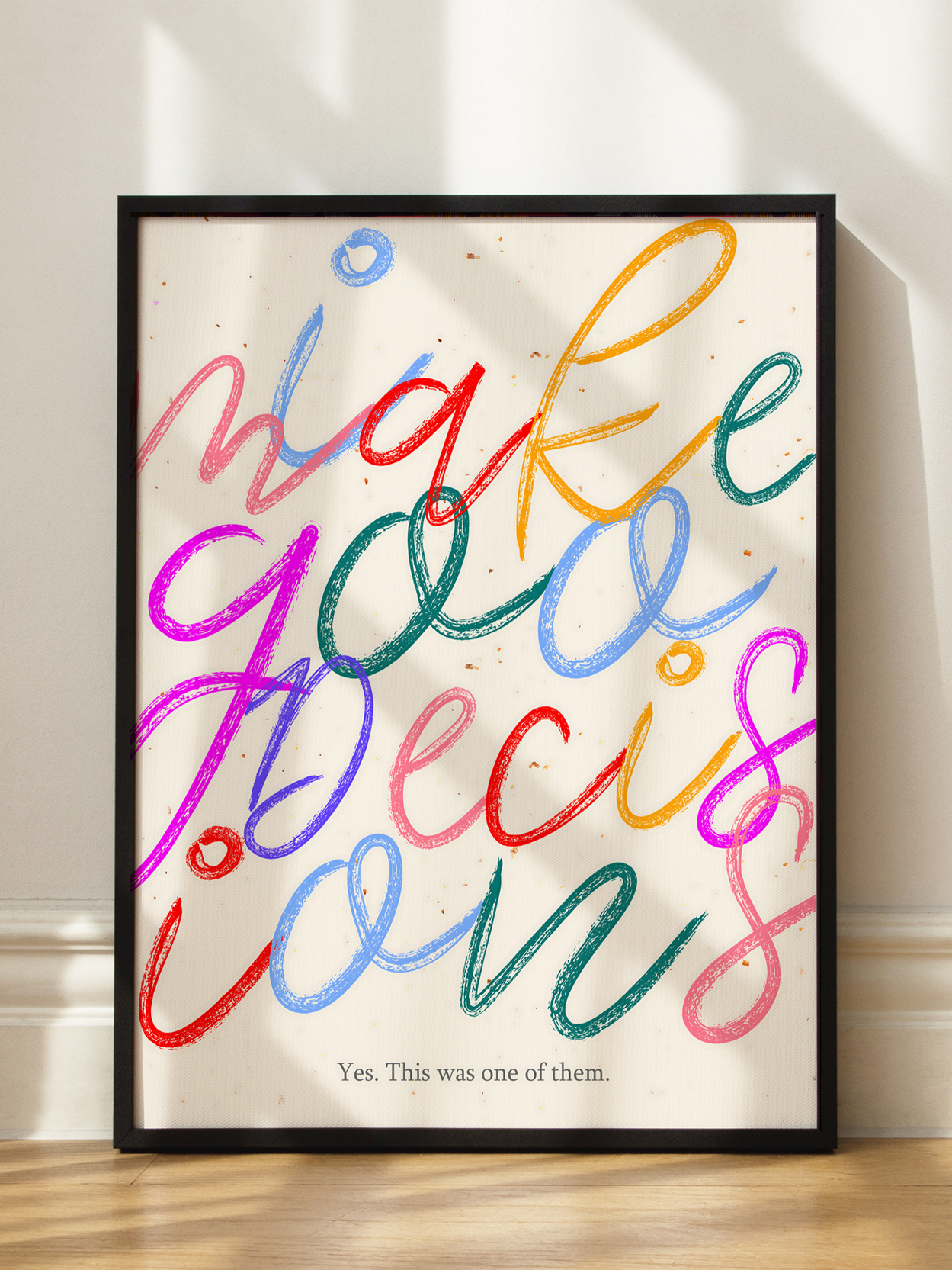 Dieses farbenfrohe Poster zeigt den inspirierenden Text "Make good decisions" in lebendigen, handschriftlichen Buchstaben. Die Buchstaben sind in verschiedenen Farben wie Rot, Blau, Grün und Gelb gehalten und verleihen dem Bild eine dynamische und positive Ausstrahlung. Darunter steht der Satz "Yes. This was one of them.", der die Botschaft der guten Entscheidungen unterstreicht. Perfekt, um jedem Raum eine fröhliche und motivierende Note zu verleihen.