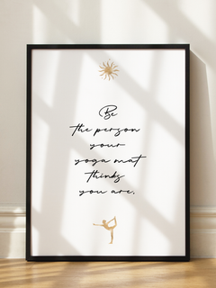 Dieses Poster zeigt das inspirierende Zitat "Be the person your yoga mat thinks you are" in eleganter schwarzer Schrift. Darüber befindet sich eine stilisierte goldene Sonne, die dem Design eine warme und positive Ausstrahlung verleiht. Am unteren Rand ist eine goldene Silhouette einer Yogafigur in einer Pose zu sehen. Dieses Kunstwerk ist ideal für Yoga-Enthusiasten und bringt eine motivierende und beruhigende Atmosphäre in jeden Raum.