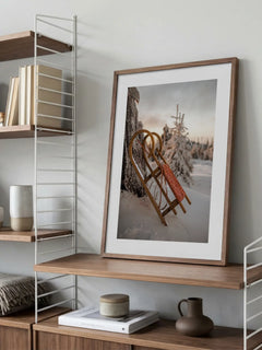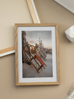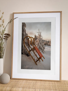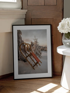 Dieses stimmungsvolle Poster zeigt einen traditionellen Holzschlitten, der an einen schneebedeckten Baum gelehnt ist. Der Hintergrund ist von einem sanften Sonnenuntergang erleuchtet, der den Himmel in warme, goldene Töne taucht. Die verschneite Landschaft und die ruhige Atmosphäre vermitteln ein Gefühl von Winterzauber und Nostalgie. Perfekt für alle, die die Schönheit der Winterzeit lieben und eine gemütliche, saisonale Stimmung in ihrem Zuhause schaffen möchten.